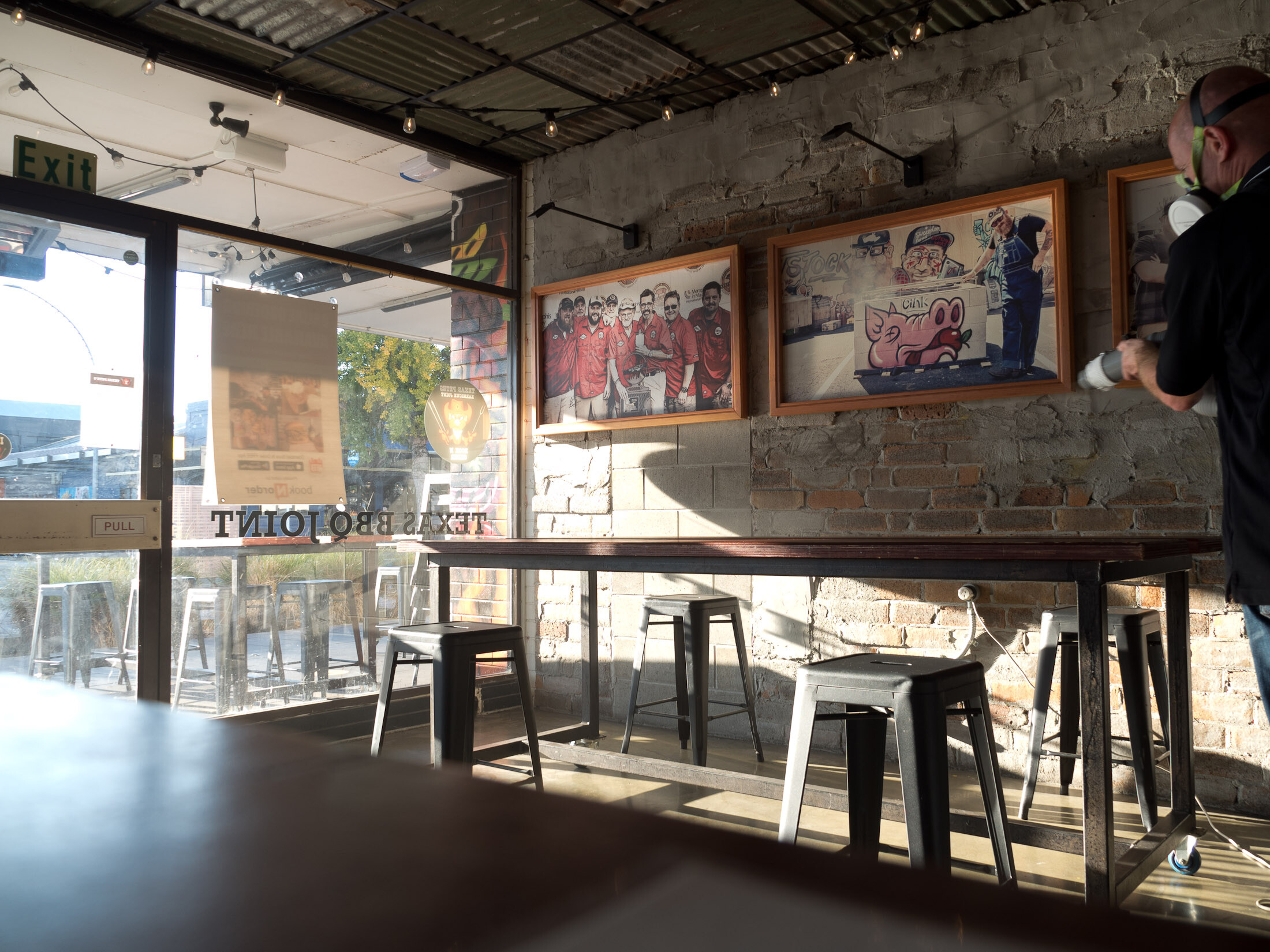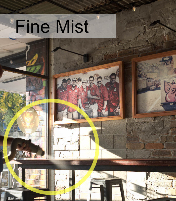 Ensuring the space is warm, and the air is moving through the air-conditioning systems. All surfaces in the restaurant were cleaned and dusted before application. When applying the microbe shield, we ensured a slow, methodical process with particular attention to touchpoints on seats and handles. Once fully cured, the microbe shield can be cleaned with typical soapy cleaning solutions. Do not use alcohol or solvent-based cleaners as these will remove the active parts of microbe shield surface protection. (More about how it works here)